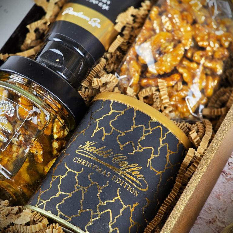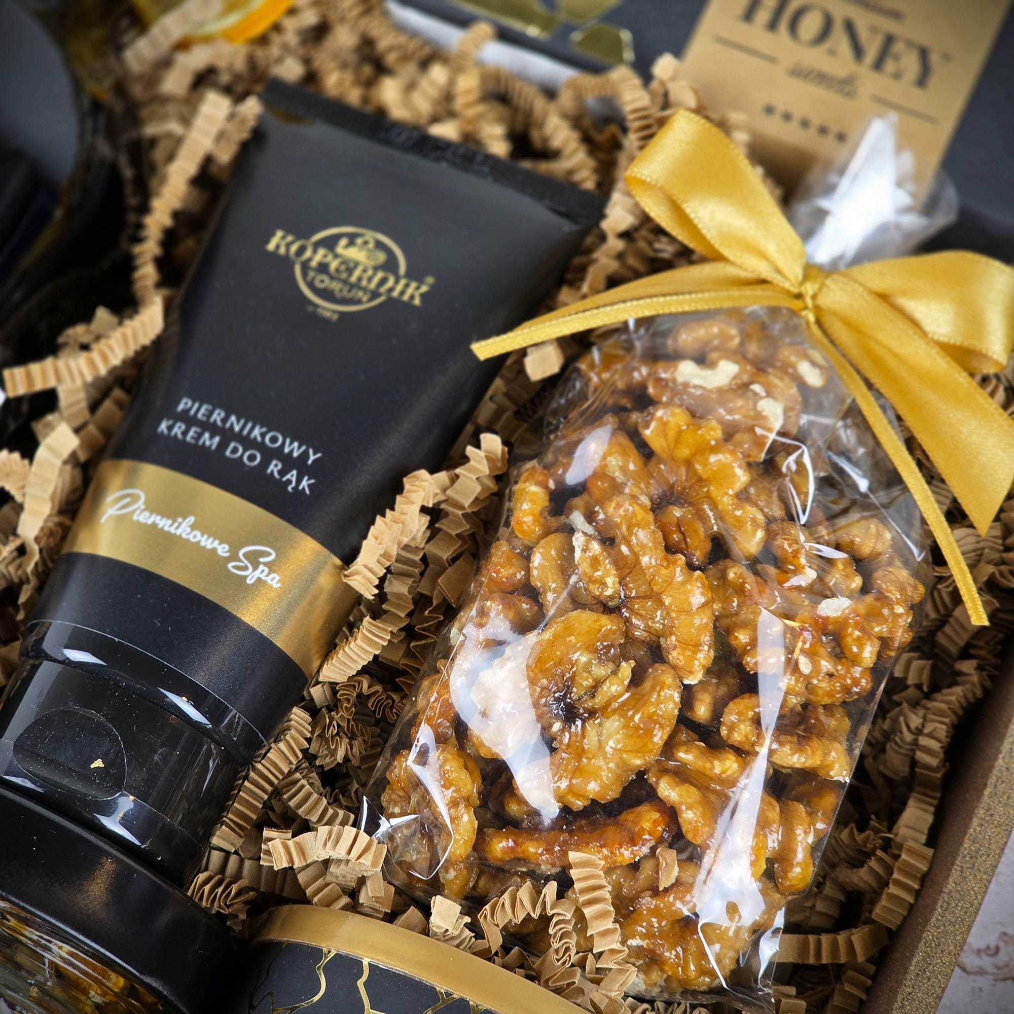 - Orzechy włoskie w karmelizowanym miodzie 100g połówki orzechów zanurzone w miodowej glazurze o intensywnym aromacie i subtelnym połysku.